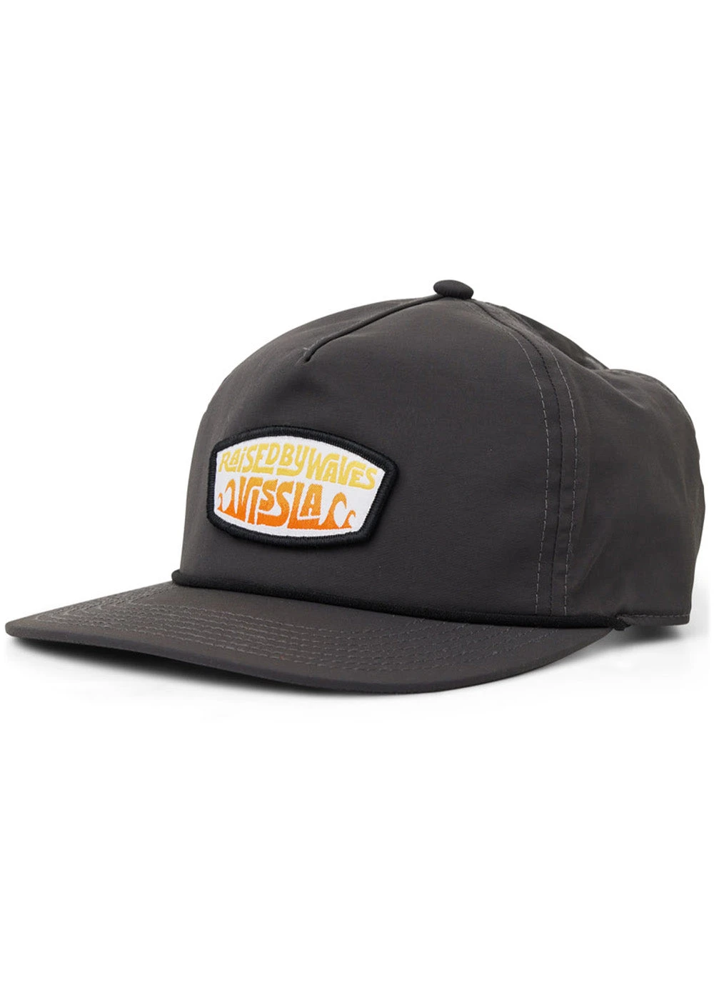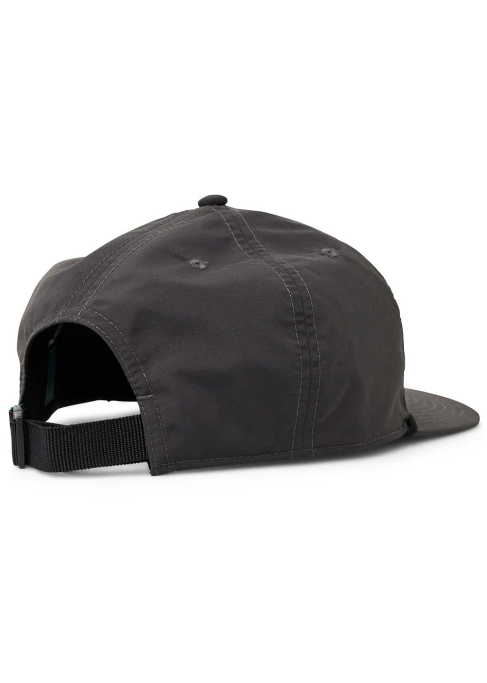 Technical function drives this recycled nylon 5-panel. Sport-mode bungee chin strap and adjustable closure ensure secure fit, enhanced by custom patch detailing.